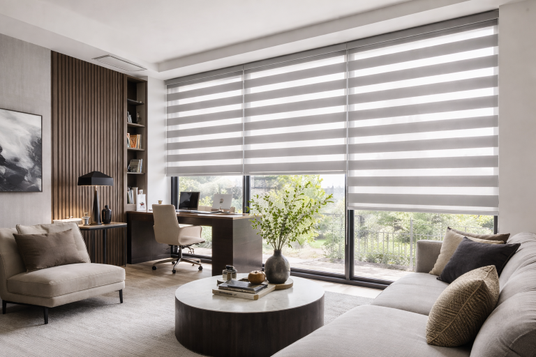Combina franjas translúcidas y sólidas con diferentes texturas para regular la iluminación con un estilo contemporáneo y elegante.